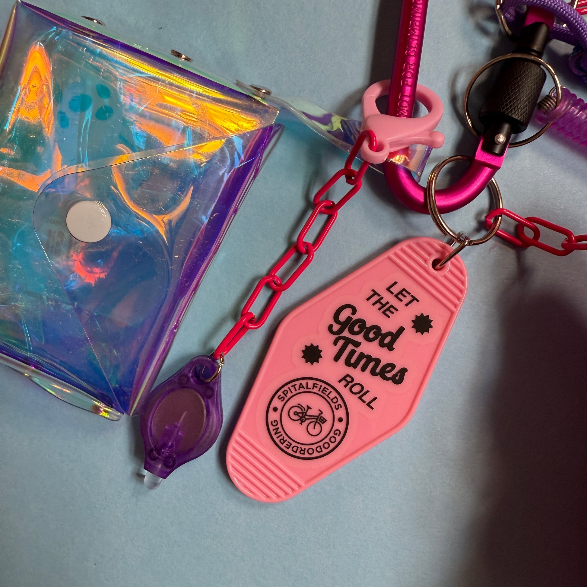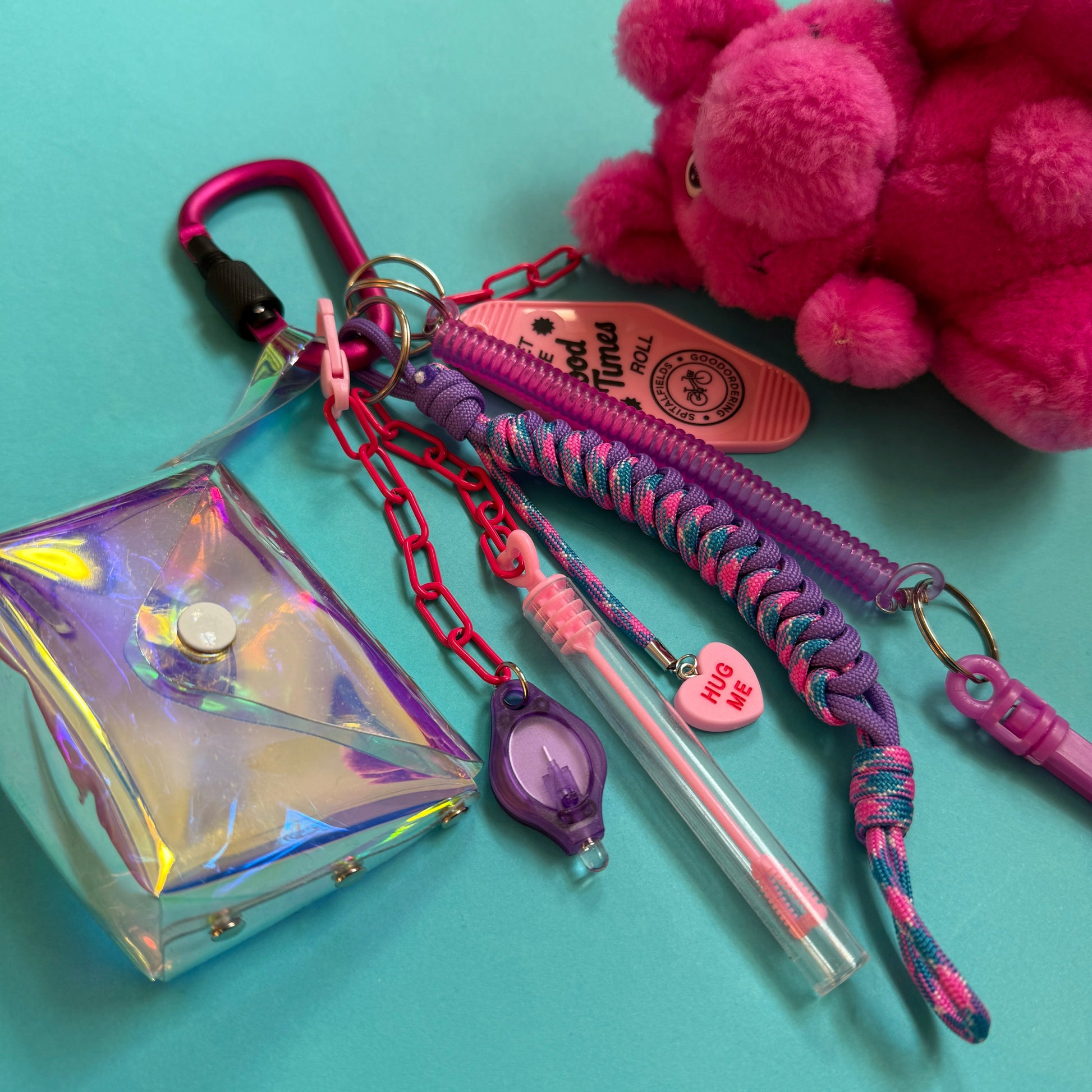 Eclectic bag charm keyring lots of fun elements attached. A soft retro vibe of cool primary colours to compliment any bag or outfit. Use together or separate into individual charms.