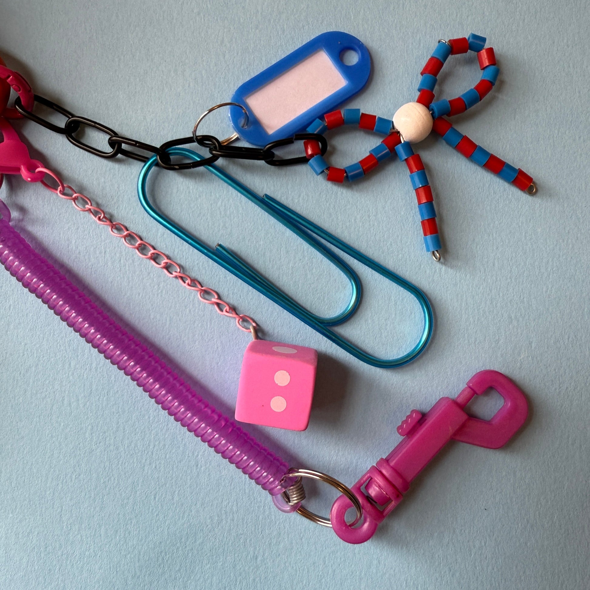 This is an eclectic bag charm keyring lots of fun elements attached. A soft retro vibe of cool primary colours to compliment any bag or outfit. Use together or separate into individual charms.